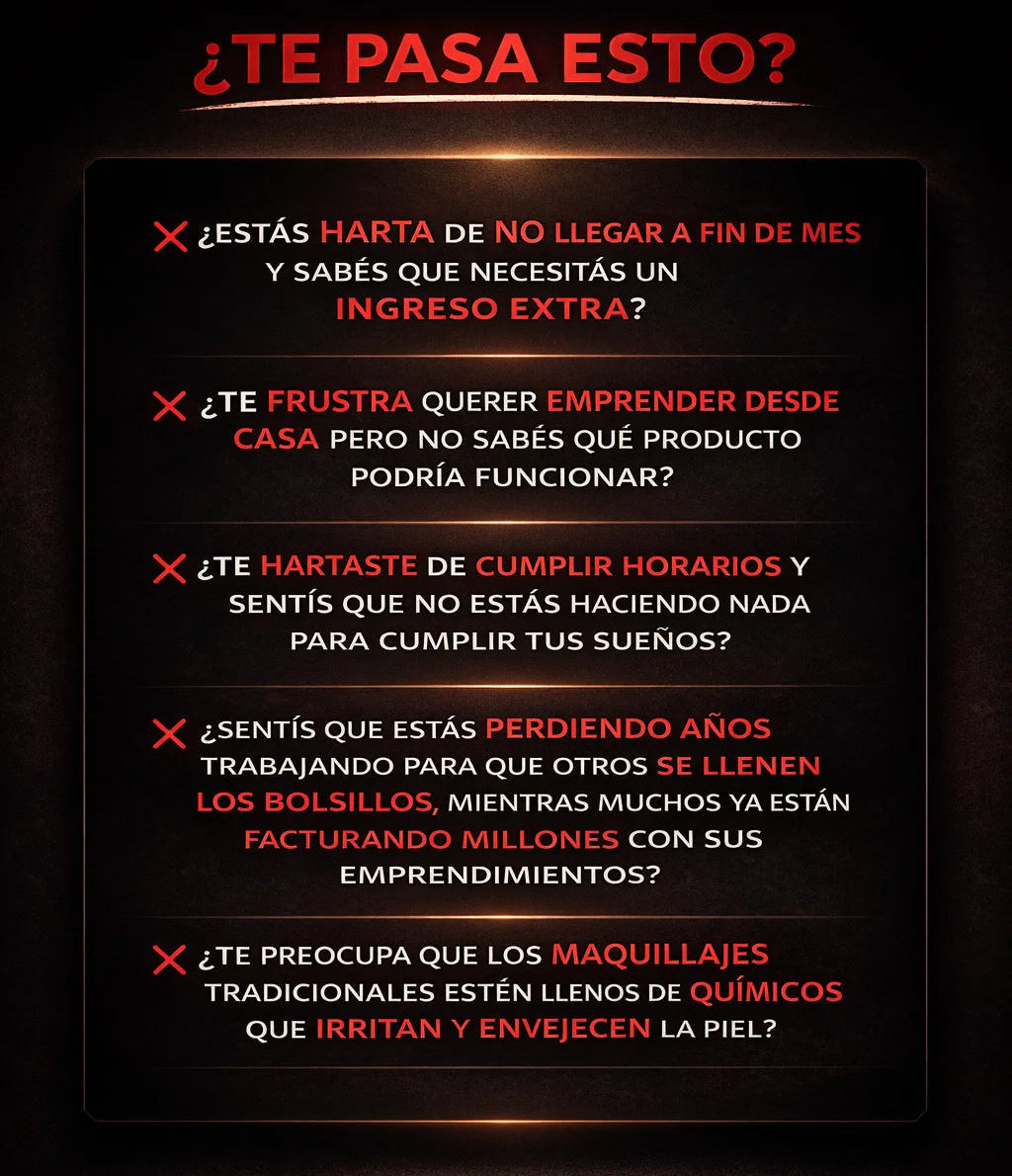 Soy maquilladora profesional, mis clientas felices con los maquillajes y cosmética naturales.. pueden maquillarse todos los días y la piel mucho más cuidada, ya no sufre ..de paso siempre surge alguna venta, superó mil veces los producos de primeras marcas.